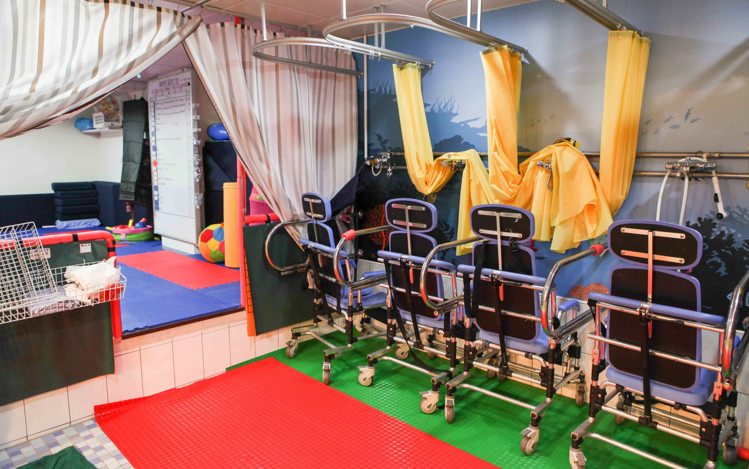 與洗澡訓練區相連,在洗完澡、身體清潔溫暖時進行肢體、軀幹一系列安全有效的運動訓練。