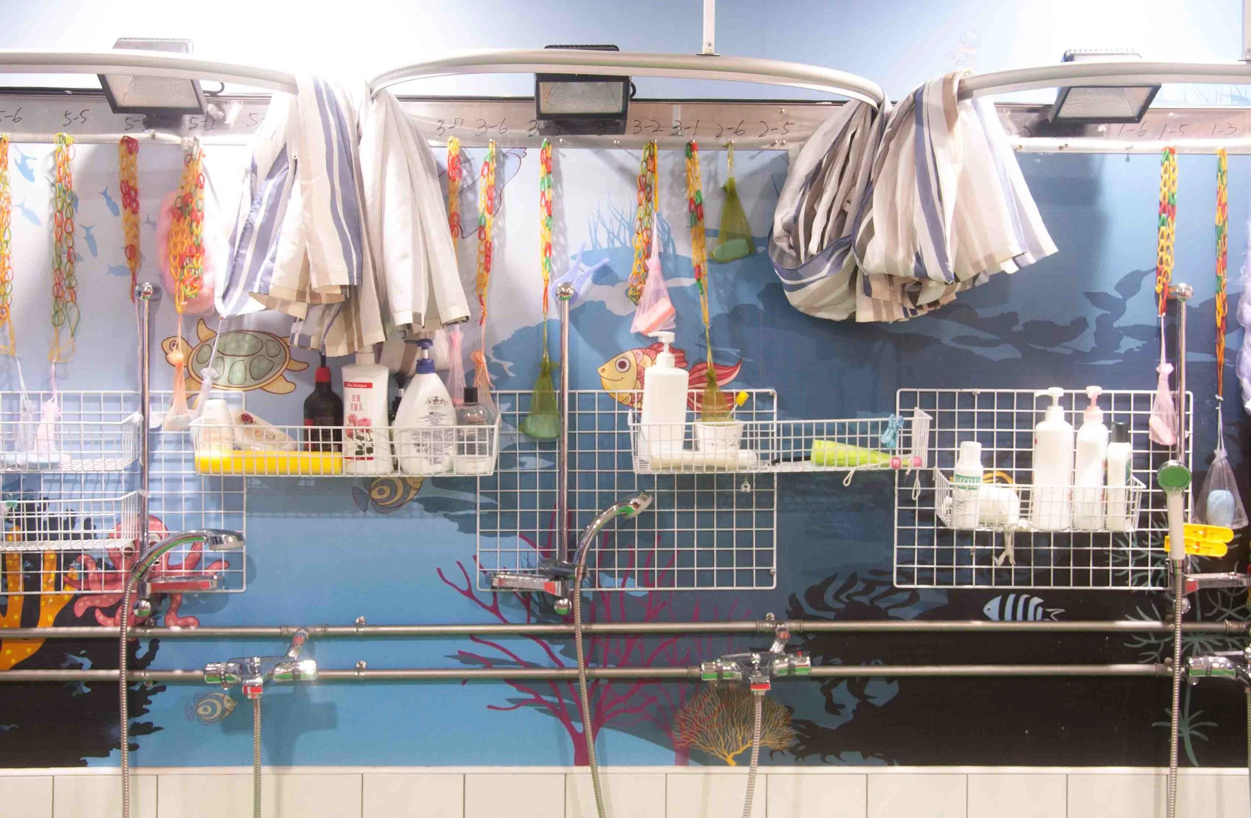 洗澡間綁上橡皮筋的肥皂,就算學員失手也不會掉到地上,蓮蓬頭也設計成可以單手開關。